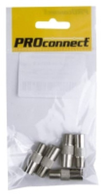 Переходник гнездо F - гнездо TV (03-084-A) PROCONNECT (комплект 5 шт.) предназначен для соединения двух кабелей волновым сопротивлением 50 или 75 Ом, имеющих на концах разные типы ТВ-разъемов. Применяется главным образом для подключения эфирного, кабельного и спутникового телевидения к телевизионному оборудованию. С одной стороны находится гнездо F-разъема, а с другой гнездо ТВ-разъема. Изготовлен переход из никелированного сплава первичной меди (биметалл), что гарантирует минимальный уровень потерь при прохождении сигнала и обеспечит долговечность соединения. Разъем соединяет кабель методом накрутки F-коннектора с одной стороны, после соответствующей зачистки контактов, и стыковки штекера ТВ с другой, не требуя в ходе монтажа применения каких-либо специальных инструментов. Такой высокочастотный соединитель имеет ряд положительных преимуществ: