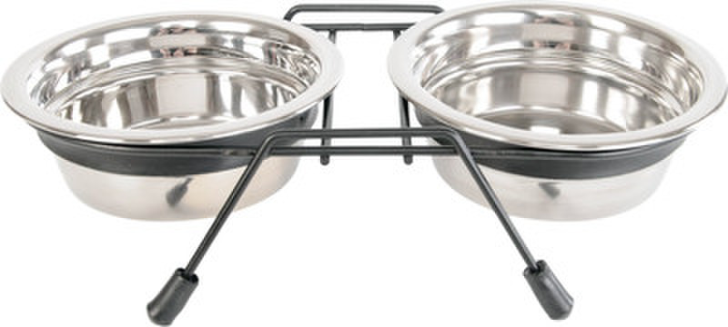 Миска на подставке – это не просто аксессуар для кормления, а важный элемент, который сочетает в себе функциональность, комфорт и стиль. Этот комплект, включающий две миски из нержавеющей стали и изящную подставку из стальных прутков, покрытых стойкой черной эмалью, станет идеальным решением для заботливых владельцев, которые хотят обеспечить своему питомцу удобство и безопасность во время еды.Миски из нержавеющей стали – это надёжный и долговечный выбор. Они устойчивы к коррозии, не вступают в реакцию с жидкостями и не влияют на вкус корма. В комплекте две миски, что позволяет использовать одну для сухого корма, а другую – для консервов или воды. Особое внимание уделено устойчивости конструкции. Ножки подставки оснащены упругими наконечниками, которые предотвращают скольжение по полу. Это обеспечивает стабильность даже при активном поведении питомца во время еды.Под ободком каждой миски надето широкое кольцо из ТПЕ (термопластичного эластомера), которое предотвращает стук и лязг мисок о подставку. Это особенно важно для чувствительных к громким звукам животных, а также для их владельцев, которые ценят тишину и спокойствие. Миски надёжно фиксируются на подставке, что исключает их переворачивание во время еды. В то же время они легко вынимаются, что упрощает процесс их мытья.• Эргономичный дизайн: компактная конструкция, которая экономит место и украшает интерьер.• Долговечные материалы: миски из нержавеющей стали устойчивы к коррозии и легко моются.• Устойчивость: ножки с упругими наконечниками предотвращают скольжение.• Тишина: кольца из ТПЕ устраняют шум во время еды.• Удобство в уходе: миски легко вынимаются и подходят для мытья в посудомоечной машине.• Функциональность: две миски для разных типов корма или воды.Подставка отличается лёгкостью и изяществом. Она занимает минимум места, при этом выглядит стильно и современно, гармонично вписываясь в любой интерьер. Благодаря компактным размерам и воздушному дизайну, конструкция не загромождает пространство, что особенно важно для небольших помещений.Исследования показывают, что миски на подставке обеспечивают более комфортное положение для питомца во время еды. Это особенно важно для собак и кошек старшего возраста, а также для животных с проблемами суставов или позвоночника. Поднятая конструкция снижает нагрузку на шею и спину, позволяя питомцу есть в естественной и удобной позе.