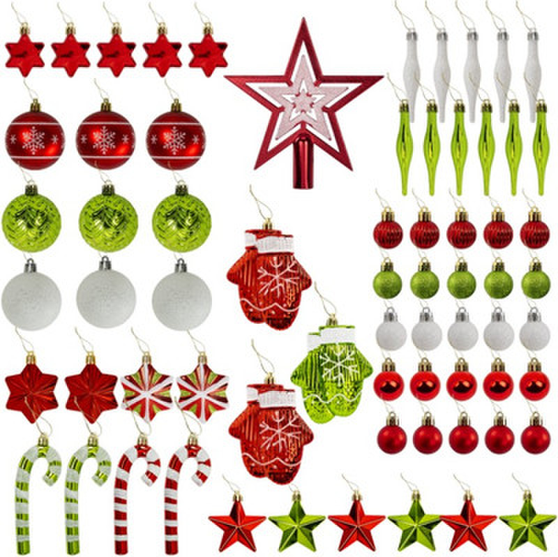 Елочные шары – непременный атрибут Нового года. Они будут отлично смотреться как на зеленой, так и на белой хвое ели. Насыщенные цвета в сочетании с отделкой разной фактуры создадут атмосферу праздника и волшебства.В наборе:3 украшения в виде варежек зеленого и красного цветов с глянцевым эффектом (размер 11 см).3 шара золотистого цвета с объемным узором с глянцевым эффектом (диаметр 6 см).3 шара красного цвета с белым рисунком с матовым эффектом (диаметр 6 см).3 шара белого цвета с эффектом «глиттер» (диаметр 6 см).6 шаров красного цвета с глянцевым и «глиттер»-эффектами (диаметр 3 см).3 шара красного цвета с золотистым рисунком с матовым эффектом (диаметр 3 см).5 шаров зеленого цвета с эффектом «глиттер» (диаметр 3 см).5 шаров белого цвета с эффектом «глиттер» (диаметр 3 см).5 шаров красного цвета с золотистым рисунком с глянцевым эффектом (диаметр 3 см).5 украшений в виде вытянутых капелек белого цвета с эффектом «глиттер» (размер 9 см).6 украшений в виде вытянутых капелек зеленого цвета с глянцевым эффектом (размер 9 см).5 украшений в виде звездочек красного цвета с глянцевым эффектом (размер 4.5 см).2 украшения в виде звездочек красного цвета с объемным узором с глянцевым эффектом (размер 6.5×8 см).2 украшения в виде звездочек красного, зеленого и белого цветов с объемным узором с глянцевым и «глиттер»-эффектами (размер 6.5×8 см).6 украшений в виде звездочек зеленого и красного цветов с глянцевым эффектом (размер 6 см).4 украшения в виде карамельных тростей зеленого и красного цветов с глянцевым эффектом (размер 12 см).1 украшение на верхушку ели в форме пятиконечной звезды красного и белого цветов с глянцевым эффектом (размер 15 см).67 нитей из полиэстера золотистого цвета длиной 30 см для подвешивания шаров.Игрушки имеют петлю для подвешивания в верхней части. Их можно использовать для украшения новогодней ели или в качестве новогоднего сувенира.Весь набор упакован в прозрачный ПВХ-короб с секциями. В верхней части короба есть ручка из ПВХ. Набор дополнительно упакован в индивидуальный трехслойный гофрокороб.
