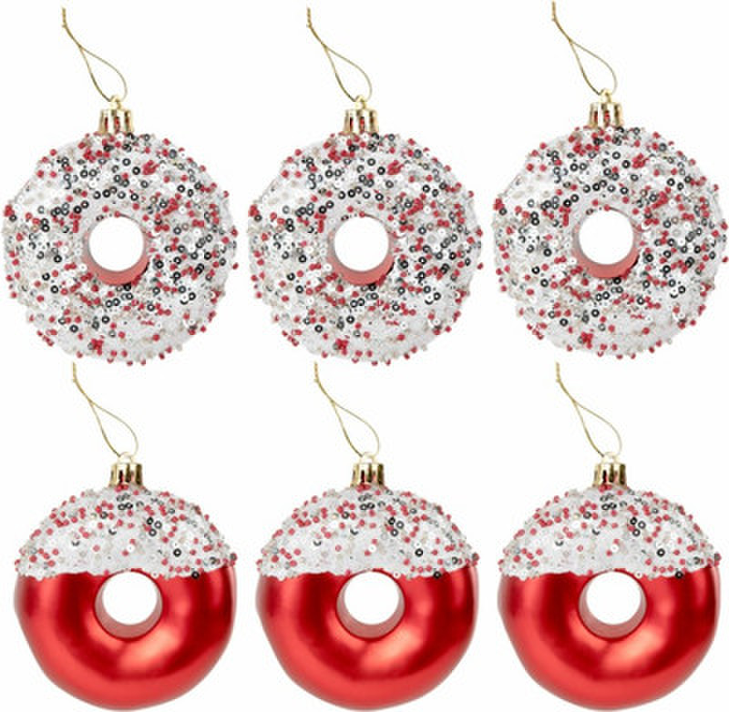 Оригинальным решением украсить новогоднюю ель станут фигурные елочные игрушки. Украшения, выполненные в форме пончика, имеют петлю для подвешивания.В наборе:3 елочных украшения диаметром 8 см в виде пончика в белой глазури с цветной посыпкой, с матовым эффектом и блестками.3 елочных украшения диаметром 8 см в виде пончика красного цвета в белой глазури с цветной посыпкой, с матовым эффектом и блестками, а также 6 нитей из полиэстера золотистого цвета длиной 30 см для подвешивания.Игрушки имеют петлю для подвешивания в верхней части. Их можно использовать для украшения новогодней ели или в качестве новогоднего сувенира.Набор упакован в картонную коробку с крышкой из ПВХ, дополнительно упакован в индивидуальный трехслойный гофрокороб.Елочные украшения «Пончики» станут прекрасным дополнением к вашей коллекции новогодних украшений.