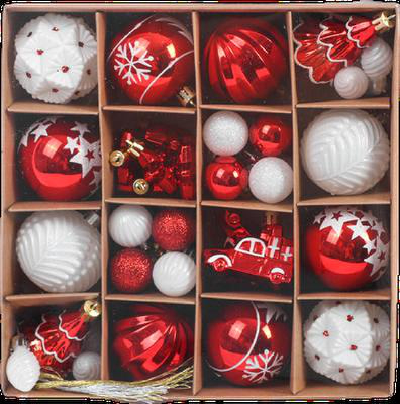 а также 42 нити из полиэстера золотистого цвета длиной 30 см для подвешивания шаров.Украшения имеют петлю для подвешивания в верхней части. Их можно использовать для украшения новогодней ели или в качестве новогоднего сувенира.Набор упакован в картонную коробку с ПВХ-крышкой, дополнительно упакован в индивидуальный трехслойный гофрокороб.