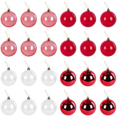 6 прозрачных шаров красного цвета,6 шаров матового красного цвета,6 шаров белого цвета с жемчужным оттенком,6 шаров красного цвета с глянцевым эффектом,а также 24 нити из полиэстера золотистого цвета длиной 30 см для подвешивания шаров.