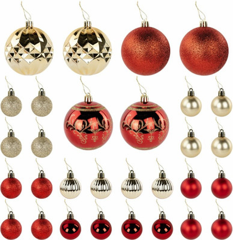 Елочные шары — непременный атрибут Нового года. Они будут отлично смотреться как на зеленой, так и на белой хвое ели. Насыщенные цвета в сочетании с отделкой разной фактуры создадут атмосферу праздника и волшебства.В наборе:2 шара красного цвета с золотыми узорами с глянцевым эффектом (диаметром 8 см).2 шара золотого цвета с глянцевым эффектом (диаметром 8 см).2 шара красного цвета с эффектом «глиттер» (диаметром 8 см).4 шара золотого цвета с эффектом «глиттер» (диаметром 4 см).4 шара красного цвета с глянцевым эффектом (диаметром 4 см).4 шара красного цвета с эффектом «глиттер» (диаметром 4 см).4 шара золотого цвета с глянцевым эффектом (диаметром 4 см).4 шара красного цвета с матовым эффектом (диаметром 4 см).4 шара золотого цвета с матовым эффектом (диаметром 4 см).30 нитей из полиэстера золотистого цвета длиной 30 см для подвешивания шаров.Шары имеют петлю для подвешивания в верхней части. Их можно использовать для украшения новогодней ели или в качестве новогоднего сувенира.Весь комплект упакован в прозрачный ПВХ-короб с секциями. В верхней части короба есть ручка из ПВХ. Набор дополнительно упакован в индивидуальный трехслойный гофрокороб.