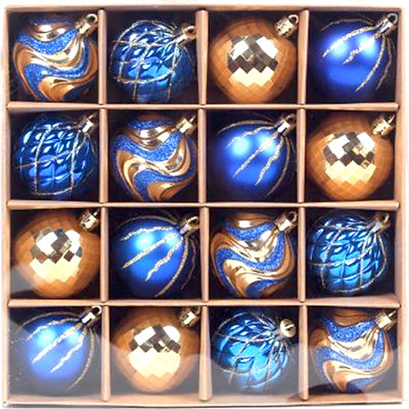 Елочные шары – непременный атрибут Нового года. Они будут отлично смотреться как на зеленой, так и на белой хвое ели. Насыщенные цвета в сочетании с отделкой разной фактуры создадут атмосферу праздника и волшебства.В наборе:4 шара золотистого цвета диаметром 8 см с глянцевым эффектом и синим рисунком с глиттером,8 шаров синего цвета диаметром 8 см с глянцевым эффектом и серебристым рисунком с глиттером,4 шара золотистого цвета диаметром 8 см с глянцевым эффектом,Также 16 нитей из полиэстера (8 штук золотистого и 8 штук серебристого цветов) длиной 30 см для подвешивания шаров.В верхней части декоративные украшения имеют петлю для подвешивания. Шары могут использоваться для украшения новогодней ели или в качестве новогоднего сувенира.Набор упакован в картонную коробку с крышкой из ПВХ, дополнительно упакован в индивидуальный трехслойный гофрокороб.