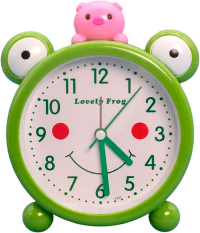 Этот будильник выполнен в забавной форме лягушки с выразительными «глазами» на корпусе и улыбающимся лицом на циферблате, что делает его привлекательным для детей. Наверху расположен небольшой элемент в виде розовой свинки, добавляющий игривости дизайну. Будильник работает от одной батарейки типа АА, которая не входит в комплект.