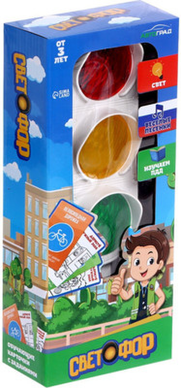 С набором «Большая дорога» прогулки на улице станут для малыша безопаснее. Обучающие карточки в наборе помогут ребёнку изучить знаки, по которым он сможет ориентироваться на проезжей части. Набор поможет ребёнку в игровой форме изучить правила дорожного движения и узнать, как вести себя на дороге. Светофор в комплекте имеет звуковые и световые эффекты, это поможет воссоздать реальную ситуацию на дороге, придумать варианты развития событий и заранее обезопасить себя от чрезвычайных ситуаций.Особенности:Звуковые эффекты: светофор воспроизводит песни.Световые эффекты: игрушка горит красным, желтым и зеленым светом.Предметы сделаны высококачественного пластика, поэтому они абсолютно безопасны для детей.В комплект входят 5 обучающих карточек с заданиями, которые помогут объяснить значения некоторых дорожных знаков.Играем с пользой:Набор «Большая дорога» поможет развить мелкую моторику рук, логическое мышление, фантазию и память малыша. Ребенок узнает правила дорожного движения и поведения на проезжей части.Как играть:Расставьте ваши машинки на импровизированной дороге и представьте, что находитесь в переполненном машинами городе.Включите светофор.Игрушка в автоматическом режиме будет сменять сигналы и воспроизводить песенки.Список песенок:Про дорожное движение.Песенки про машины.КомплектацияСветофор.5 карточек.