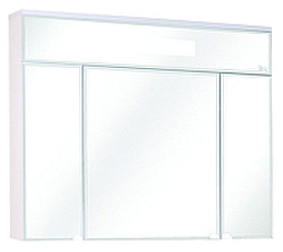 Внешне это отражается в лаконичной прямоугольной форме без ручек и лишнего декора и стильной люминесцентной подсветке. В дверцах разного размера с механизмом плавного закрывания, скрывающих просторное пространство для хранения необходимых вещей, разделенное на 3 части стеклянными полочками с еврокромкой.