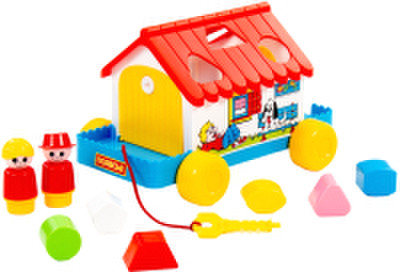 С двух сторон домика есть дверки, которые открываются, и можно достать из домика фигурки. Одна из дверок открывается ключом. Кроме того, в комплект входят 2 фигурки человечков, они устанавливаются в специальные углубления и позволяют ребёнку разыгрывать различные сюжеты. Домик можно катать благодаря наличию колёсиков и шнурка.