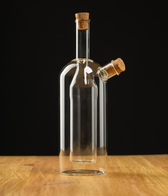 Стеклянная бутылка для масла с двумя отделениями обеспечивает удобное хранение кулинарных жидкостей. Прозрачный корпус позволяет контролировать уровень содержимого. Общая конструкция объединяет основное отделение 350 мл и дополнительный отсек 50 мл.Пробковая крышка гарантирует герметичность при хранении масел, сиропов и соусов. Стеклянный материал сохраняет нейтральность вкуса и не впитывает посторонние запахи. Двухсекционная конструкция подходит для одновременного хранения разных видов продуктов.Высота бутылки 20.5 см позволяет компактно размещать ее на кухонных полках.Использование бутылки способствует организованному размещения маринадов, уксусов и ликеров. Раздельные емкости предотвращают смешивание ароматов различных жидкостей.
