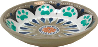 Стильная неглубокая бежевая миска с принтом из отпечатков лапок и цветов.