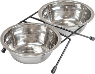 Кормушка напольная с двумя мисками из нержавеющей стали. Для собак мелких пород, щенков и кошек. Предназначена для единовременного размещения корма и воды при кормлении. Может применяться как в домашних, так и в уличных, или в походных условиях. Особенно удобна при содержании и кормлении животного в клетке, в поездках, при выездах с животным на природу. Кормушка компактная и лёгкая. Устойчивая подставка металлическая сварной конструкции имеет прочное полимерное покрытие (окрашена порошковым методом). Для предотвращения скольжения и в целях травмобезопасности ножки кормушки снабжены пластиковыми наконечниками. Цвет подставки чёрный.