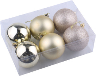 Набор поможет преобразить интерьер, наполнить его сладостной атмосферой наступающих зимних праздников. Елочные шары — непременный атрибут Нового года. Цвет «светлое золото» в сочетании с отделкой разной фактуры создадут праздничное настроение.