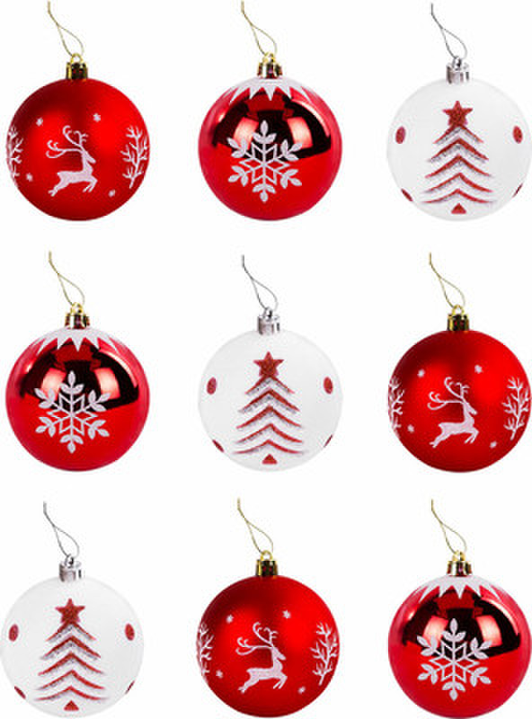 В комплекте 9 шаров диаметром 8 см:3 шара красного цвета с рисунком и с глянцевым эффектом,3 матовых шара красного цвета с рисунком белого цвета,3 матовых шара белого цвета с рисунком красного цвета,А также 9 нитей из полиэстера золотистого цвета длиной 30 см для подвешивания шаров.