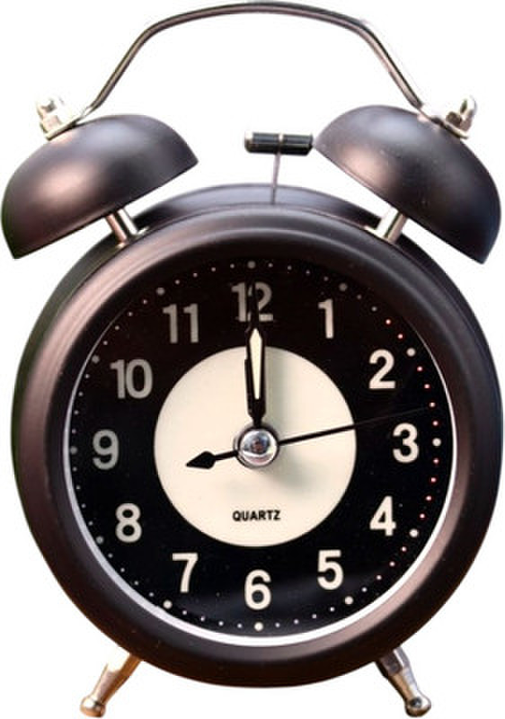 Это классические аналоговые часы-будильник с двумя колокольчиками в верхней части, что придаёт им ретро-стиль. Корпус круглой формы, окрашен в чёрный цвет, циферблат с контрастными белыми цифрами, что облегчает считывание времени. Центральная часть циферблата выделена светлым кругом, на котором расположены стрелки для часов и минут, а также указатель секунд. Часы выглядят стильно и могут стать отличным декоративным элементом в интерьере, а также выполнять функцию надёжного будильника.