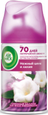 Наслаждайтесь изысканным ароматом шелка и лилии в течение 70 дней. Сменный баллон освежителя воздуха поможет поддерживать в доме приятный и свежий аромат. Средство прекрасно борется с любыми нежелательными запахами. Его можно устанавливать на кухне, в ванной комнате или туалете. Аэрозоль не оставляет разводов и других следов на занавесках, мебели и других предметах.